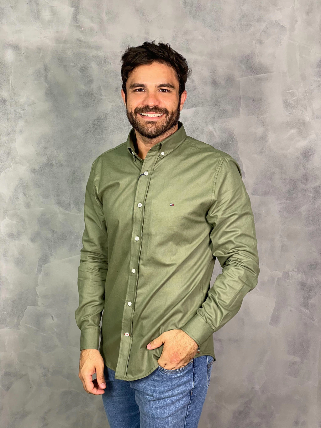 O tom militar traz personalidade ao visual, mantendo a sofisticação clássica da Tommy Hilfiger. Possui golinha button-down, fechamento em botões personalizados, punhos ajustáveis e o tradicional bordado da bandeira Tommy Hilfiger no peito, garantindo originalidade e estilo.
