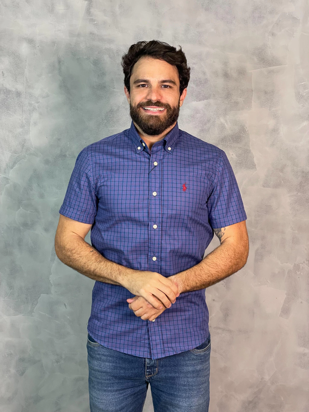 O xadrez em tons de azul traduz elegância e versatilidade, enquanto o bordado vermelho do icônico Pony Ralph Lauren adiciona personalidade e sofisticação ao visual.