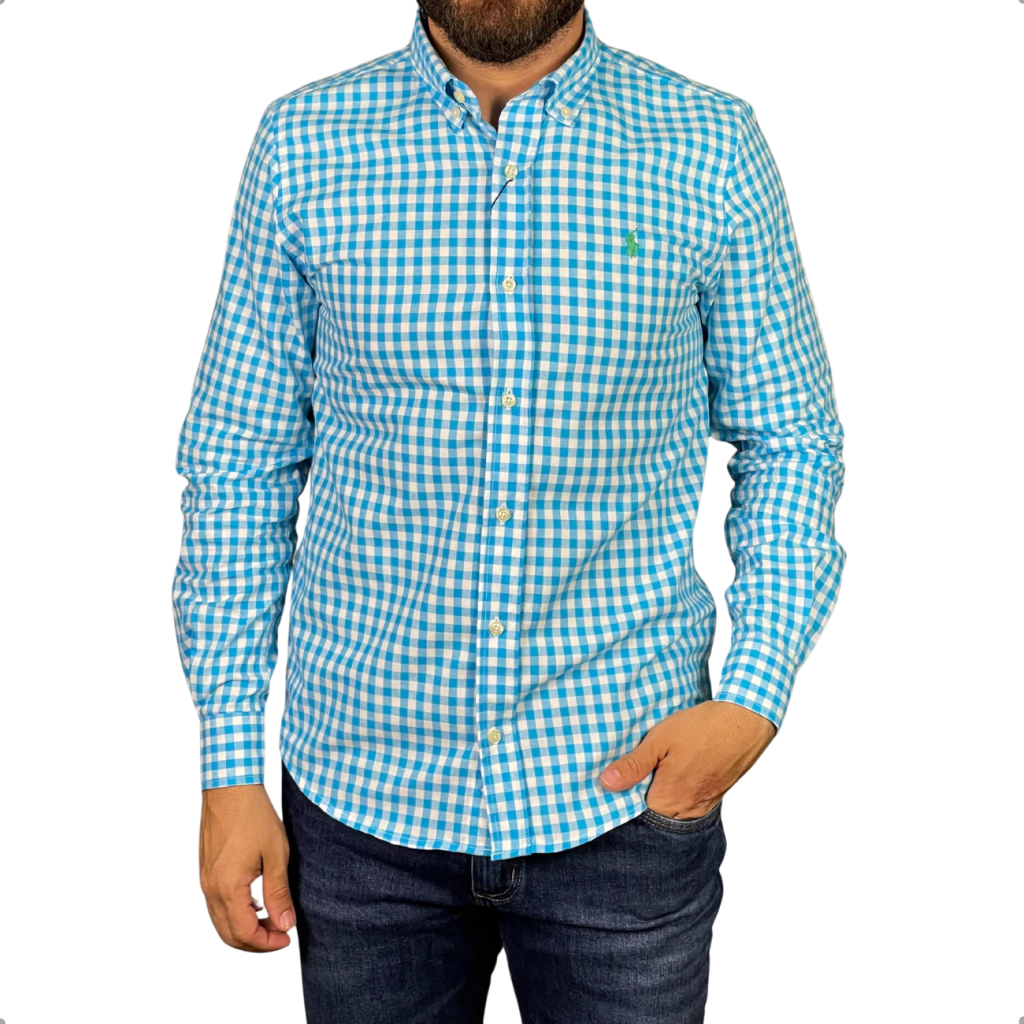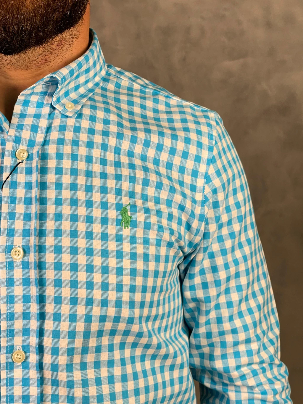 O padrão xadrez em tons de azul é realçado pelo icônico logo Polo Ralph Lauren bordado em verde, garantindo identidade e sofisticação. Ideal para ocasiões casuais ou formais, a camisa conta com fechamento por botões, colarinho clássico e punhos ajustáveis.