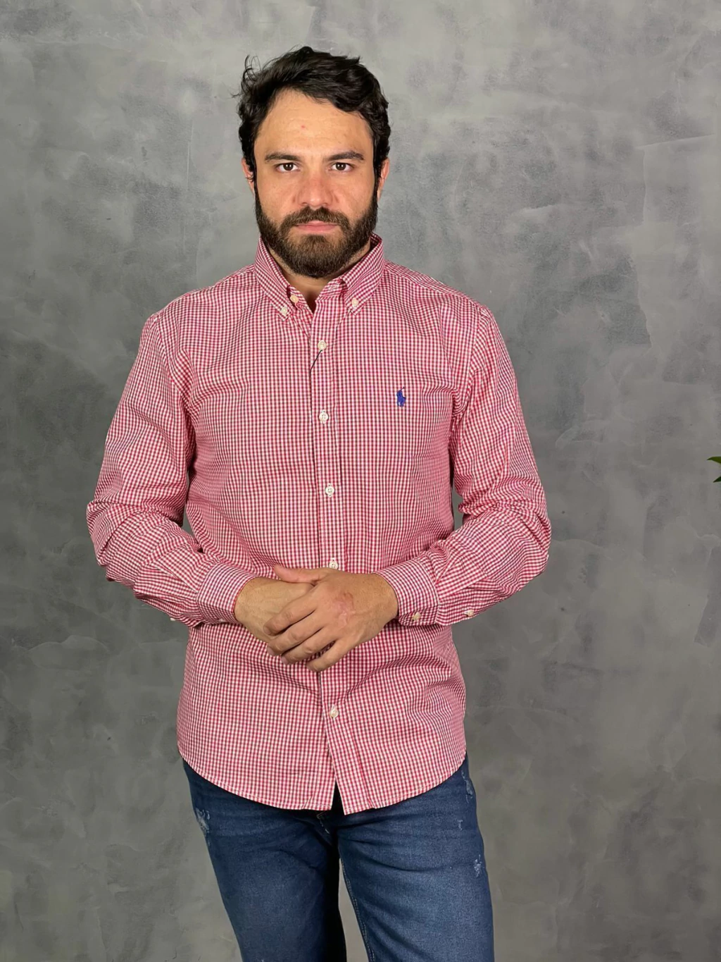 Seu padrão xadrez em tons de vermelho transmite personalidade e estilo, enquanto o tradicional bordado do logo Pony em azul bic no peito confirma a autenticidade e o prestígio da marca Ralph Lauren.