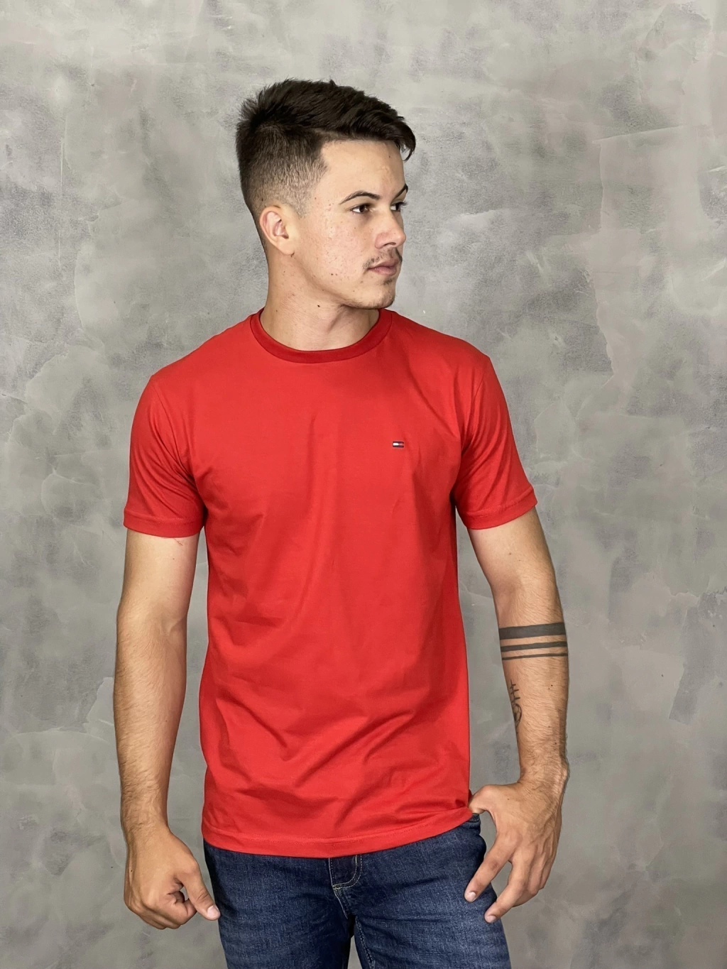 Confeccionada em tecido de alta qualidade, esta camiseta proporciona um toque macio e respirável, ideal para o clima brasileiro. O vibrante tom vermelho confere um visual moderno e ousado, perfeito para compor looks casuais ou até mesmo para ocasiões mais descontraídas.